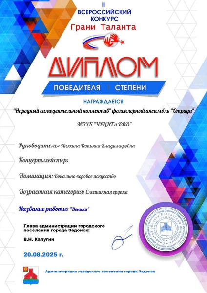 Коллектив стал победителем I степени Всероссийского конкурса «Грани таланта», в очередной раз доказав свой высокий профессионализм и преданность народному искусству. Эта награда — заслуженное признание вашего упорного труда и того искреннего тепла, которое вы дарите зрителям.