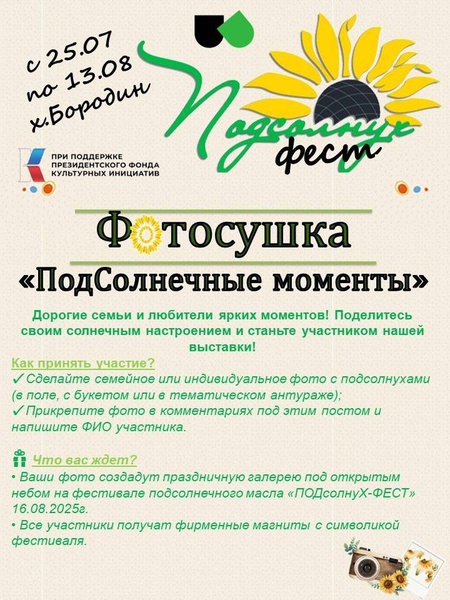 Приглашаем вас принять участие в фотосушке «ПодСолнечные моменты», которая проводится в рамках проекта «ПОДсолнуХ-фест», при поддержке Президентского фонда  культурных инициатив.